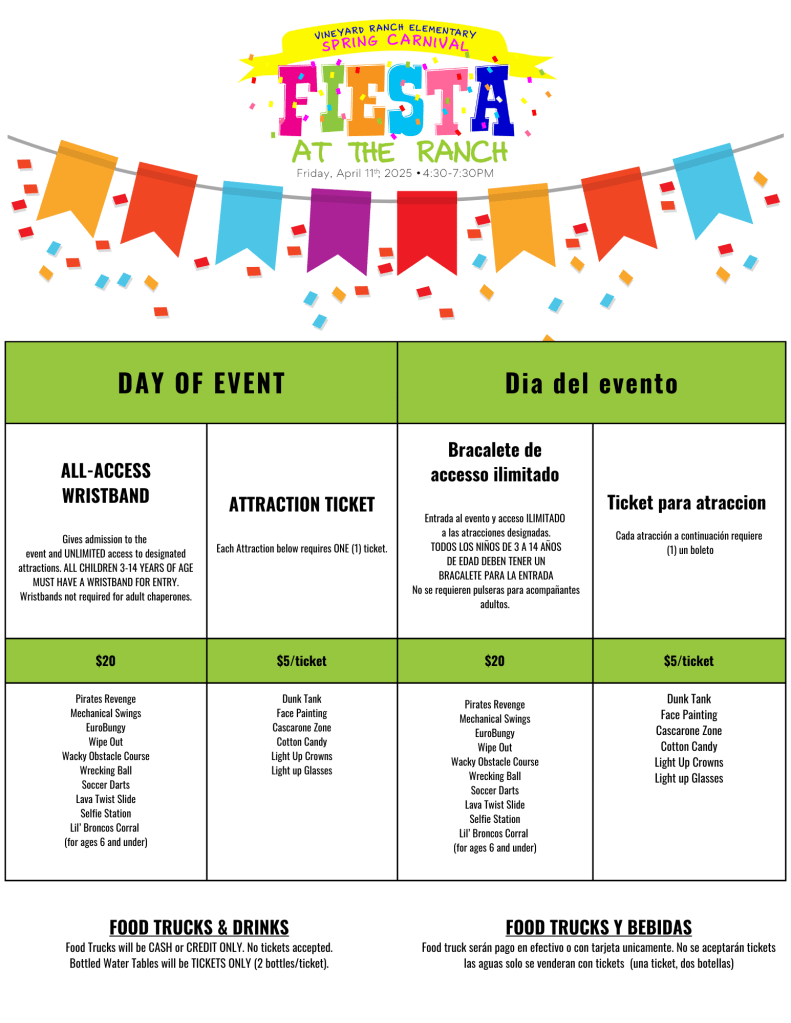 Our Fiesta-themed Spring Carnival will feature food & drinks from your favorite food trucks, carnival attractions, a silent auction, entertainment and so much more!